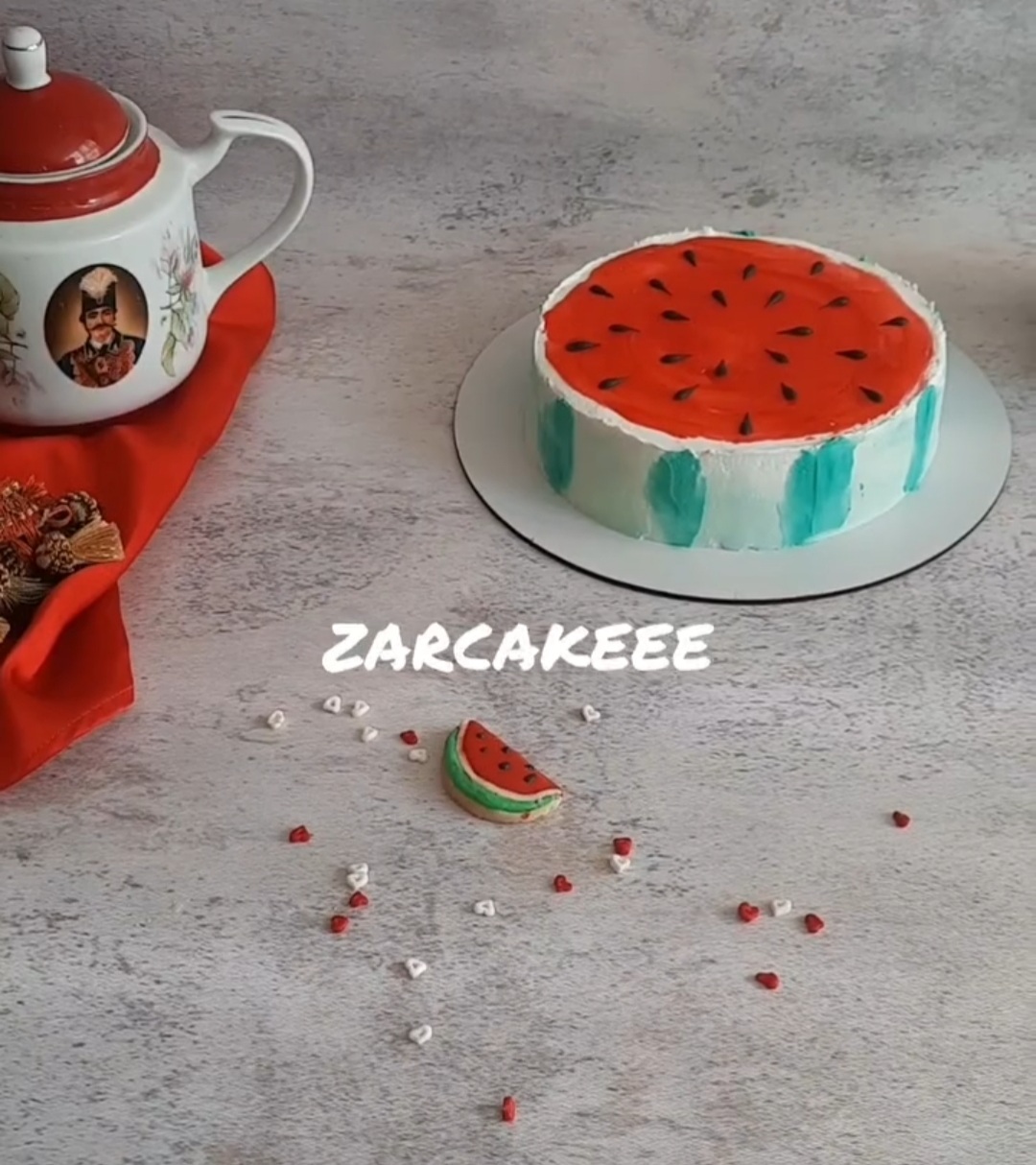 کیک یلدا مدل هندوانه خامه ای باروکش ژله قرمز وفیلینگ موز وگردو