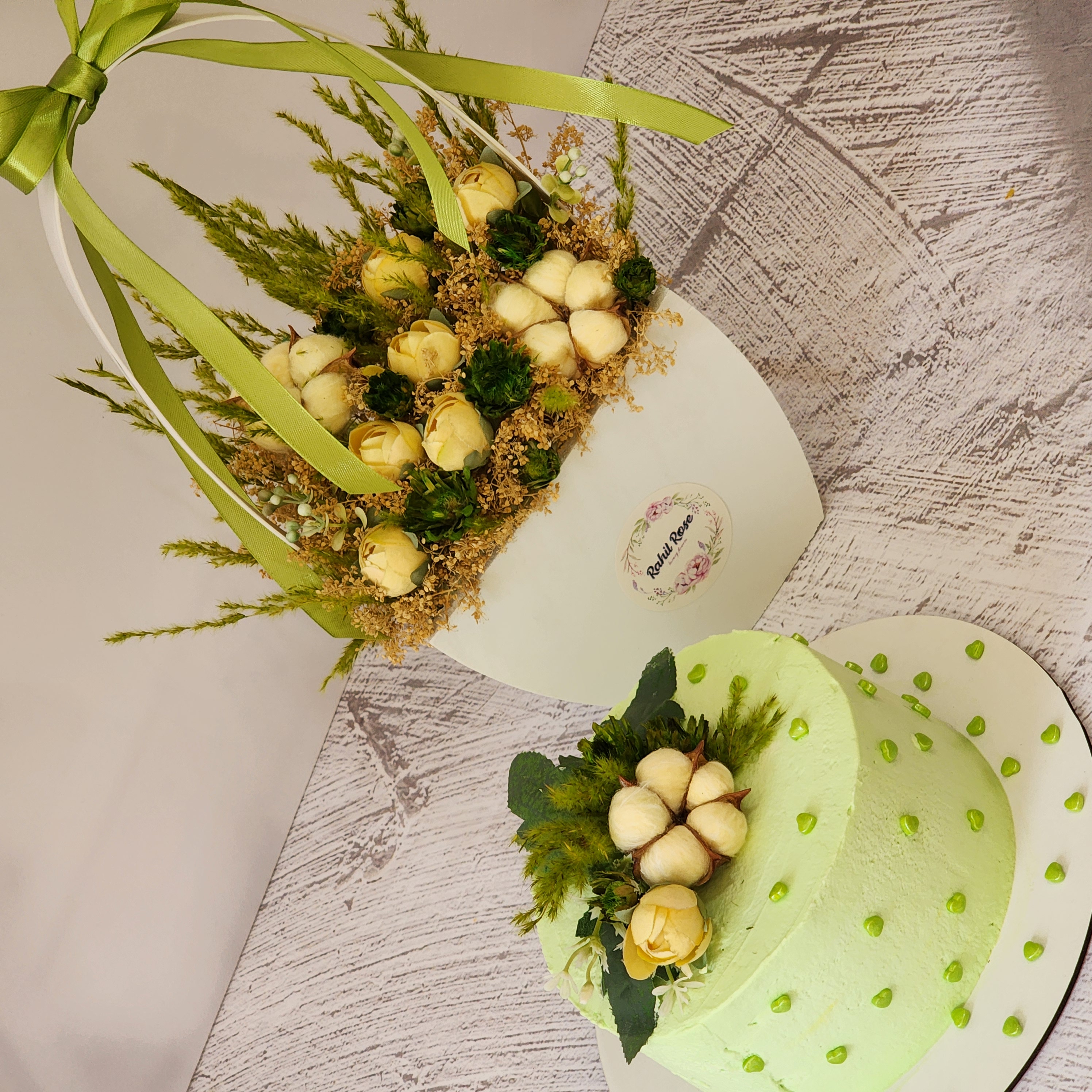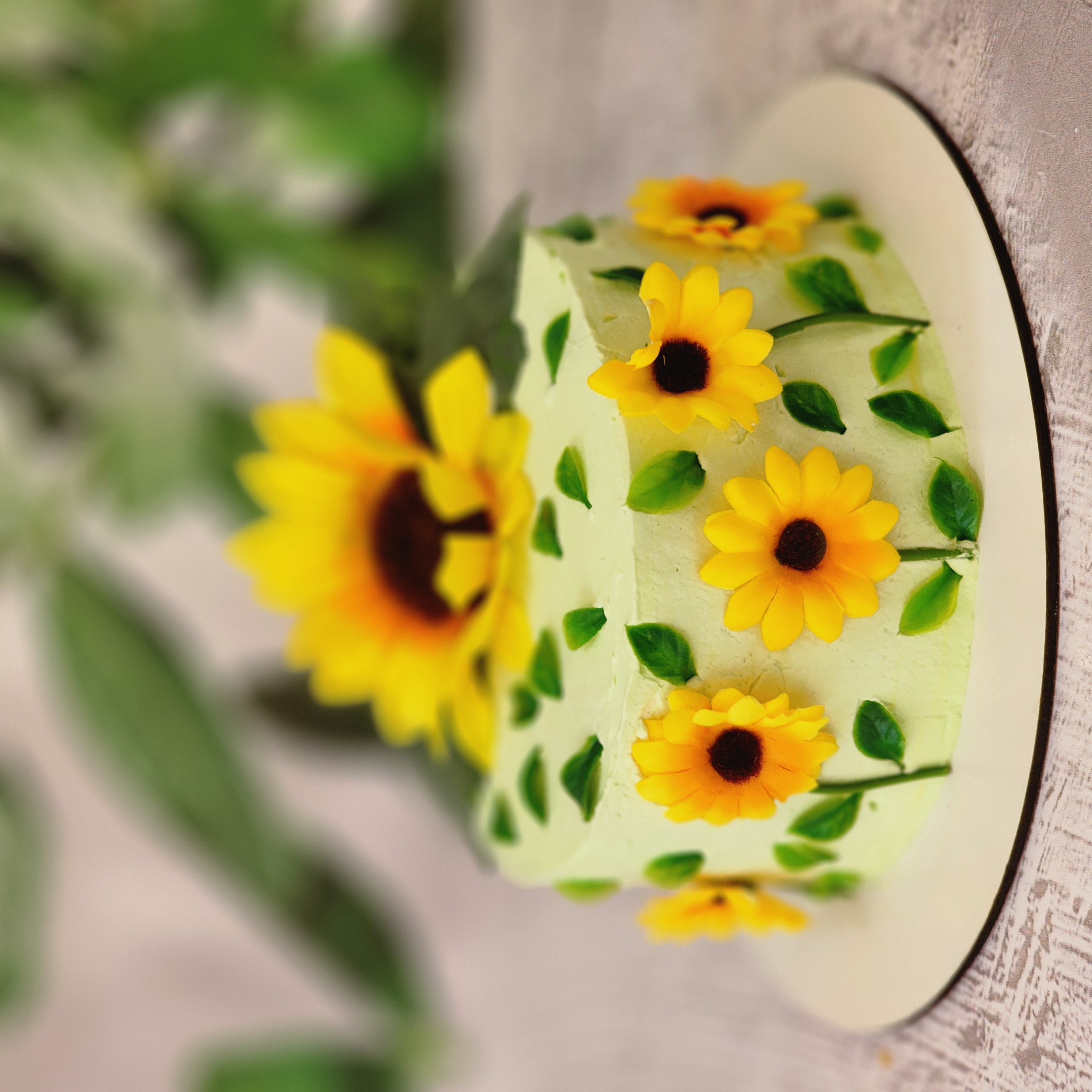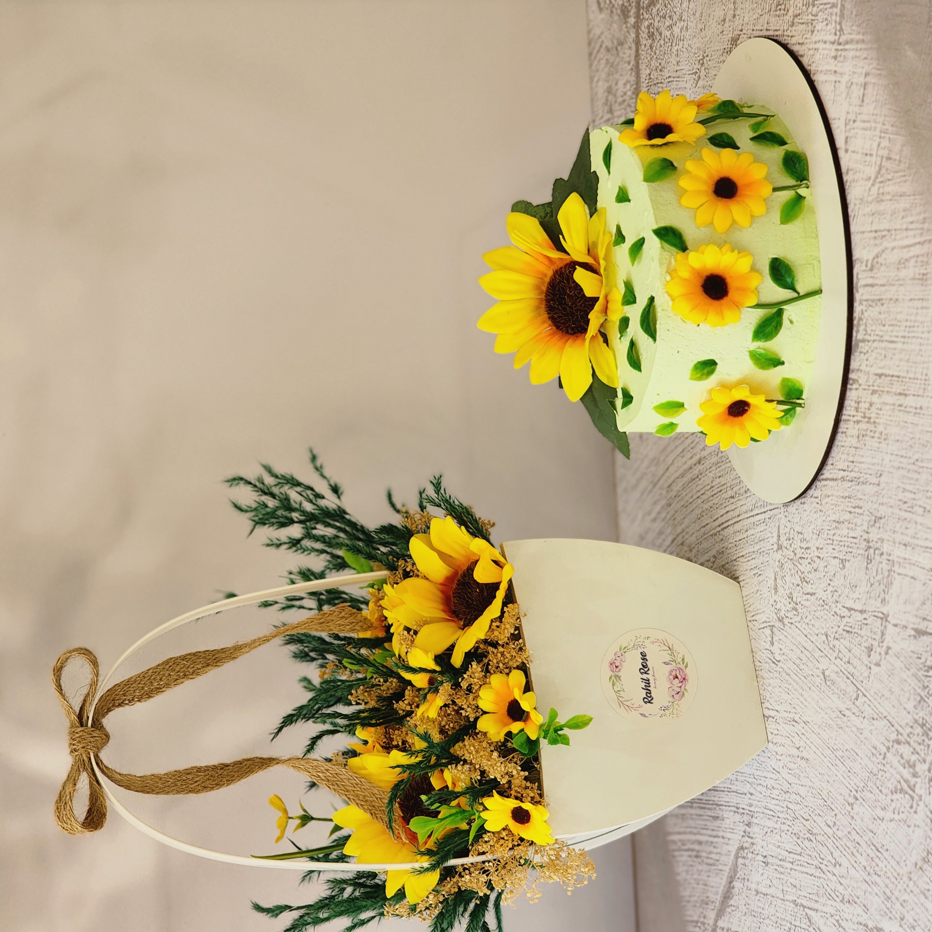 کیک افتابگردان وانیلی با خامه وانیلی یک کیلو ونیم و دسته گل