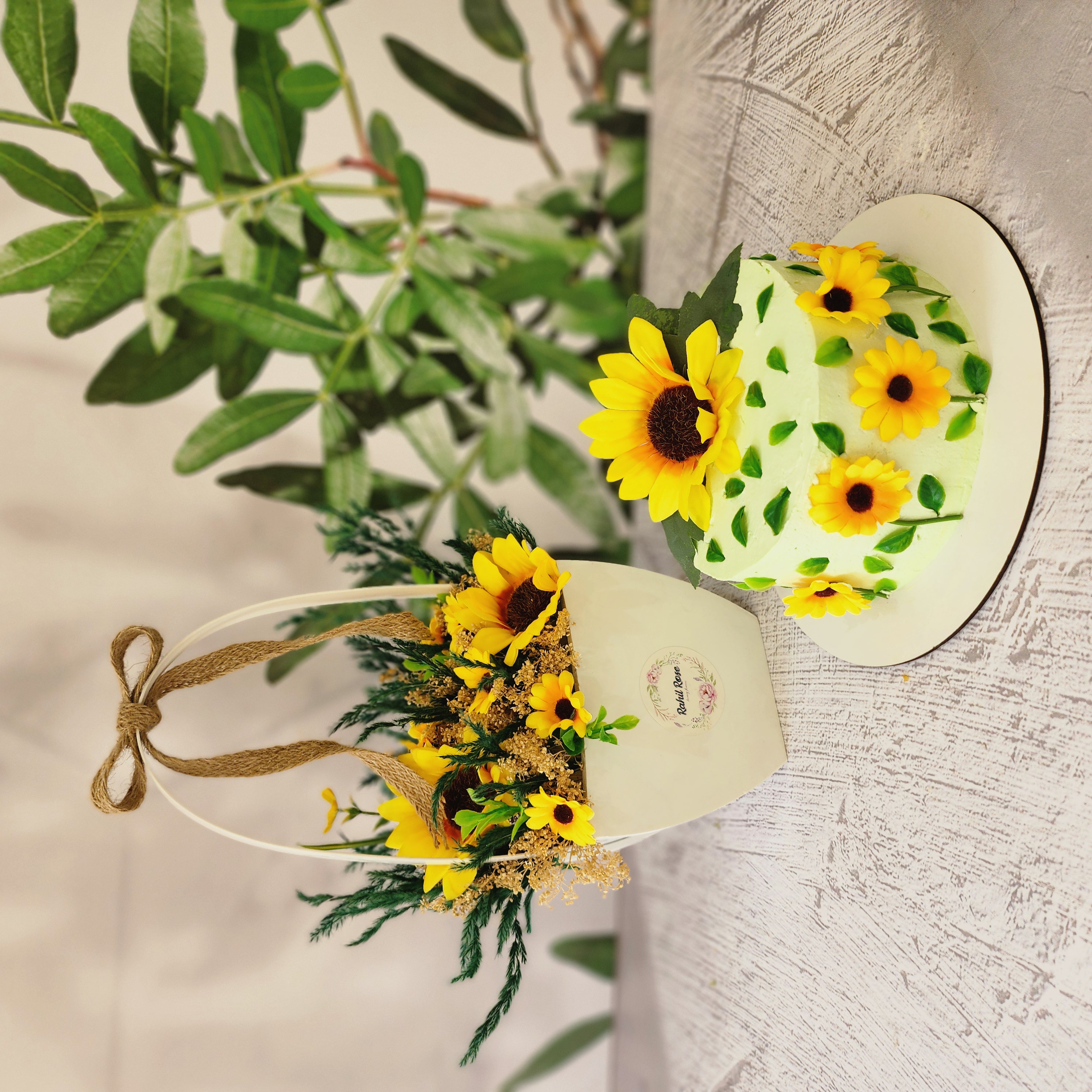 کیک افتابگردان وانیلی با خامه وانیلی یک کیلو ونیم و دسته گل