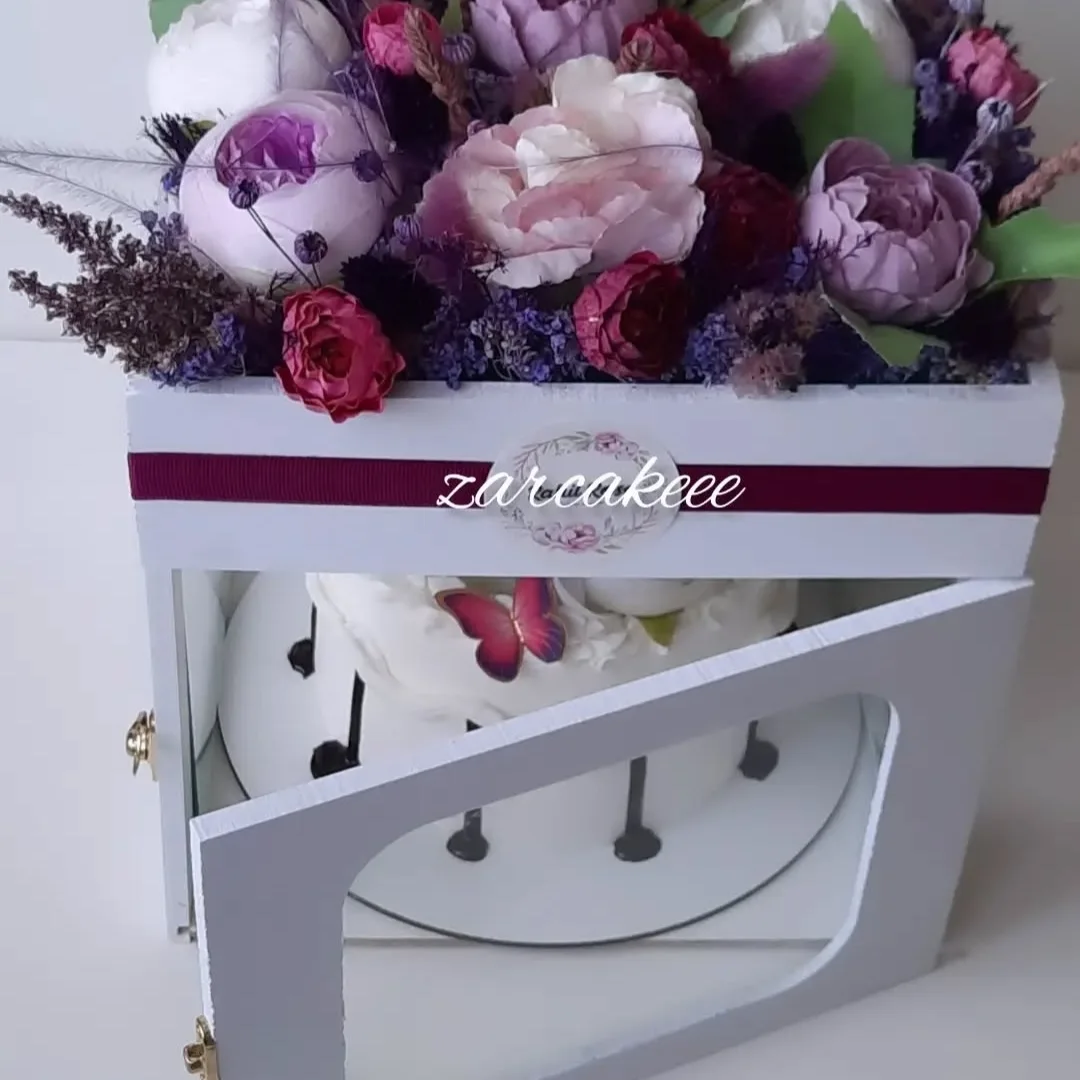 کیک با باکس گل وزن کیک یک کیلو خامه ای با موز وگردو